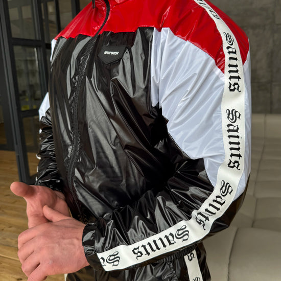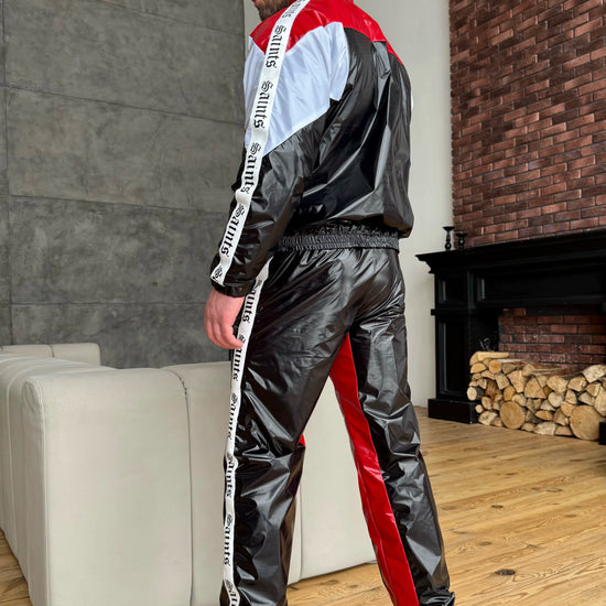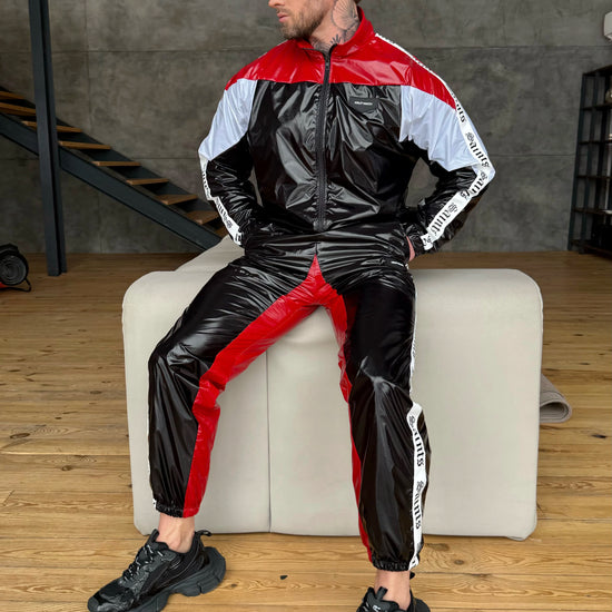 Чоловічий спортивний костюм MNKLLY KRUTYAKOV чорно-червоний — це акцентний, “злий” streetwear-комплект, який виглядає максимально дорого вживу й у кадрі. Глянцева фактура з вініловим ефектом створює чіткий, преміальний блиск, а контрастні вставки чорний + червоний + білий збирають образ у спортивну “motorsport” естетику. Декоративні стрічки на рукавах додають характеру та візуально витягують силует — костюм читається як дизайнерська річ, а не базова спортивка.