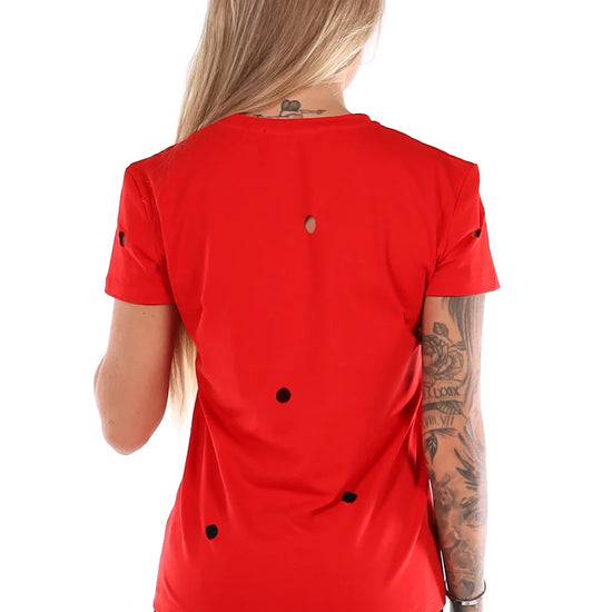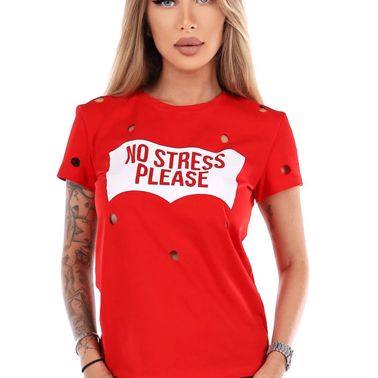 Насичений червоний колір, акцентний принт “NO STRESS” та трендові декоративні розрізи створюють унікальний модний аутфіт для прогулянок, фотосесій, вечірок і щоденного стилю. Ця модель чудово поєднується з джинсами, лосинами або шортами.