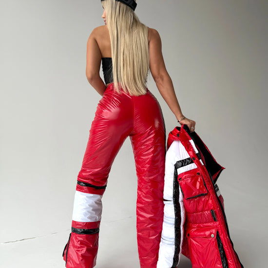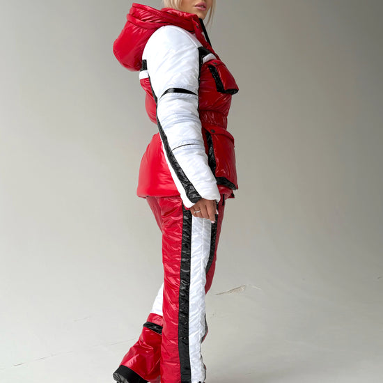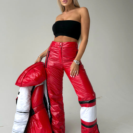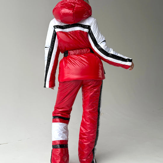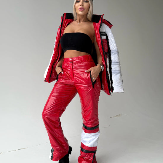 Виконаний у насиченому червоному кольорі, цей жіночий лижний костюм створює яскравий, упевнений образ, який виділяє серед натовпу — і на схилі, і в місті.