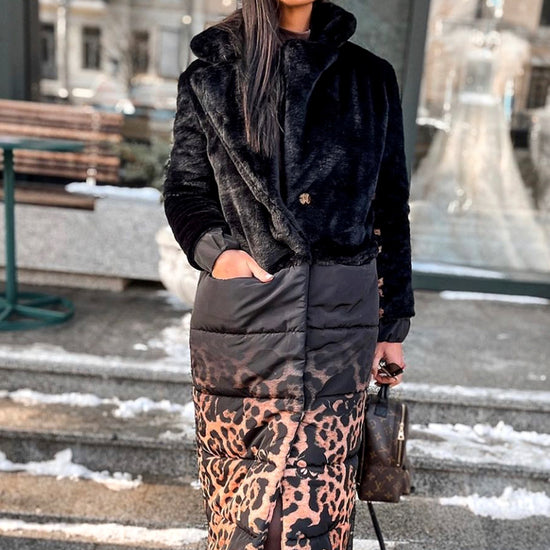 Жіноча шуба KRUTYAKOV LEO — це дизайнерський вибух стилю, тепла й харизми. Верх виготовлений з преміального екохутра чорного кольору, а низ ефектно доповнений тканинною вставкою з леопардовим принтом, яка додає дикого шарму.