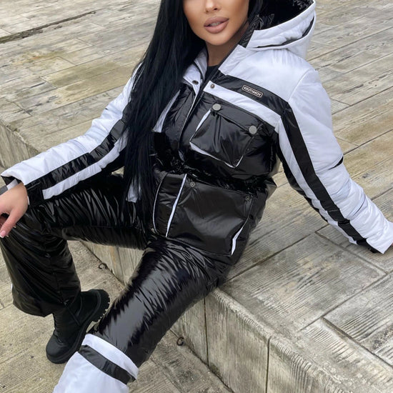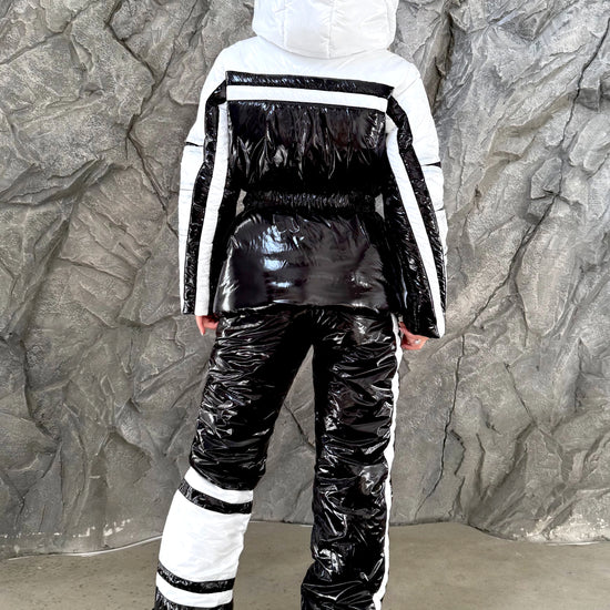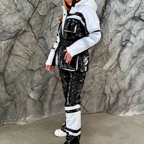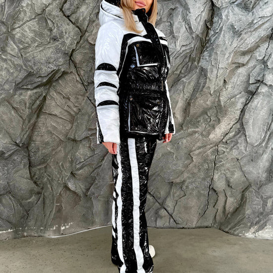 Виконаний у трендовому чорно-білому кольорі, цей жіночий лижний костюм ідеально підходить як для катання на лижах чи сноуборді, так і для зимових прогулянок або відпочинку в горах.