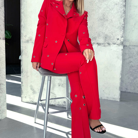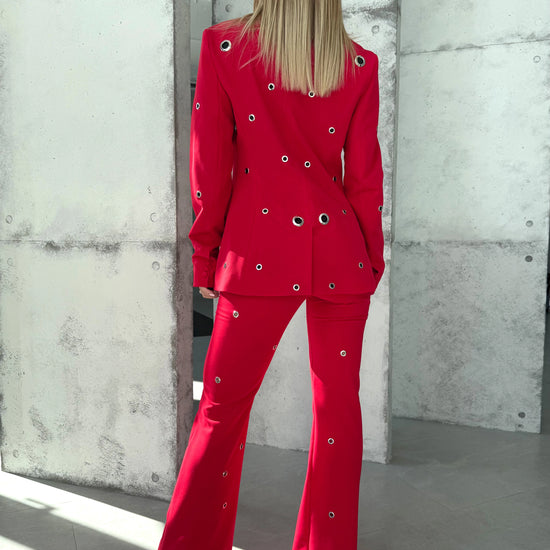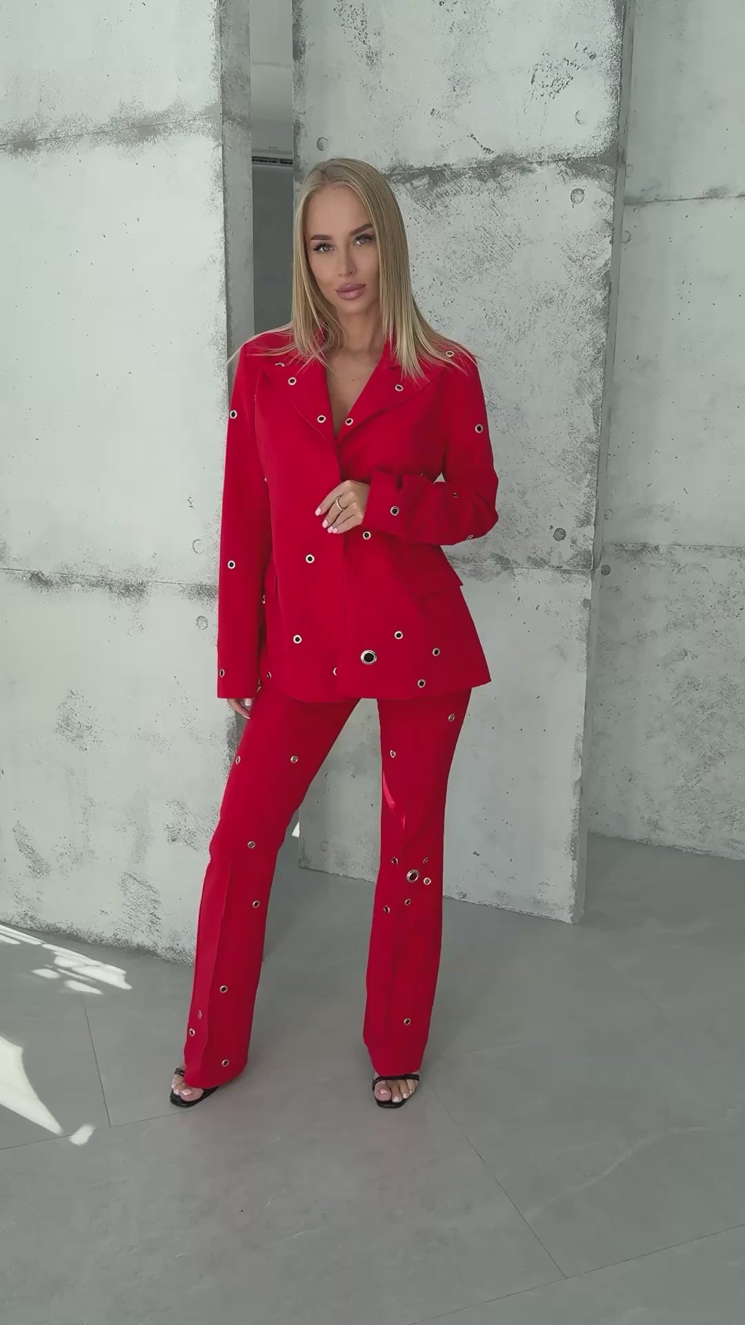 Цей червоний костюм — ідеальне поєднання стриманості та сміливих деталей. Прямі брюки та піджак класичного крою доповнені люверсами різного розміру, що додають образу неочікуваного акценту і виразної стилістики.