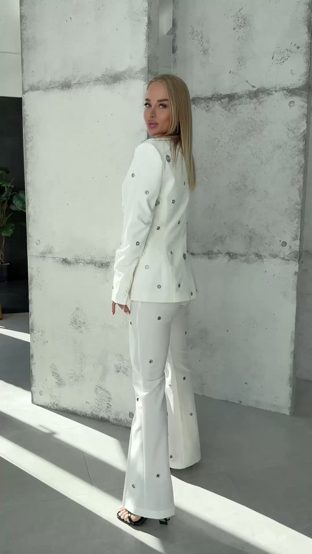 Цей білий костюм — ідеальне поєднання стриманості та сміливих деталей. Прямі брюки та піджак класичного крою доповнені люверсами різного розміру, що додають образу неочікуваного акценту і виразної стилістики.