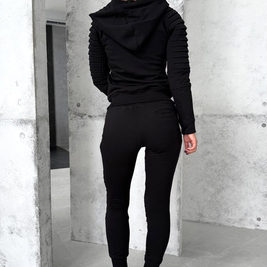 Цей костюм — про баланс між функціональністю та стилем. Лаконічний чорний колір, рельєфні елементи і всі кишені на блискавках — усе продумано до дрібниць. Це не просто зручно — це виглядає дорого й впевнено.