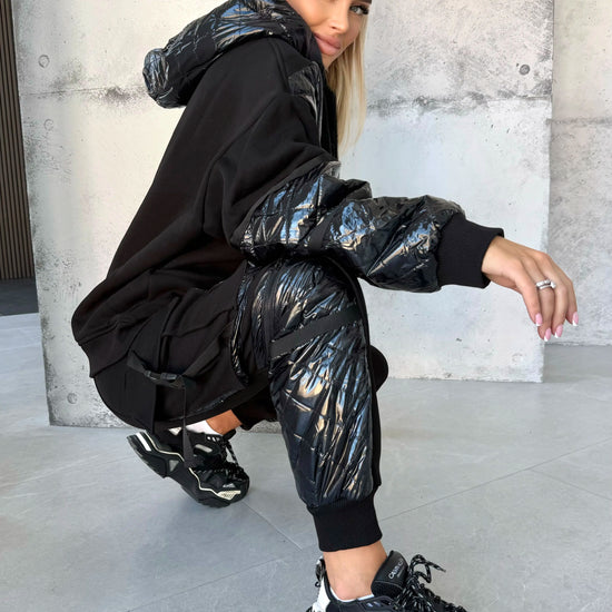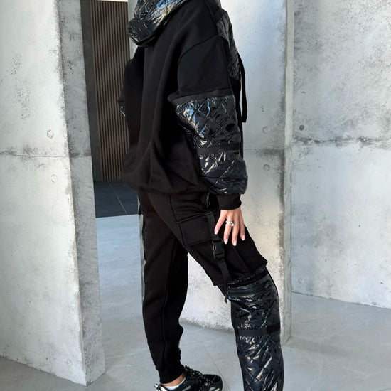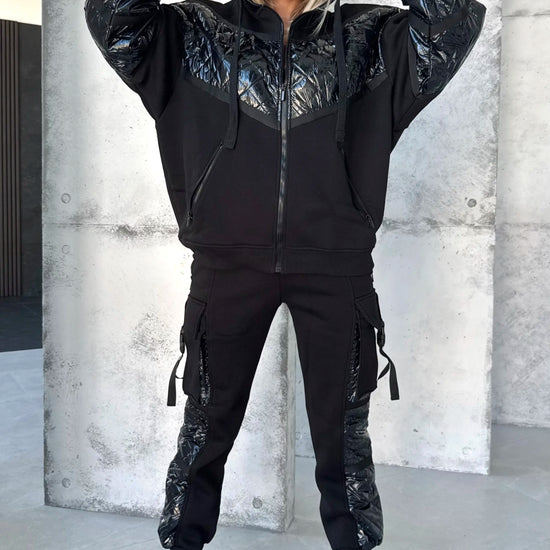 Це не просто костюм — це унікальний формат утепленого кежуалу, який виглядає дорого, носиться зручно й виділяється продуманими деталями. Глибокий чорний колір + декор зі стьобаної плащової тканини створюють стриманий, але дуже ефектний образ.