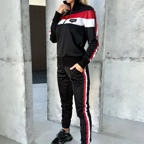 Цей костюм — ніби з фешн-фоток 90-х: стриманий чорний, лампаси з боків, блискавка. Він не для спортзалу, а для стильних прогулянок, подорожей і міського chill’у.