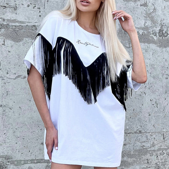 Жіноча футболка KRUTYAKOV ANKORA у білому кольорі — це стильний елемент гардеробу з характером. Вільний оверсайз крій підходить на розміри від XS до XXL, даруючи максимальний комфорт і свободу рухів. Спереду — чорна бахрома та брендовий принт, які створюють модний акцент.