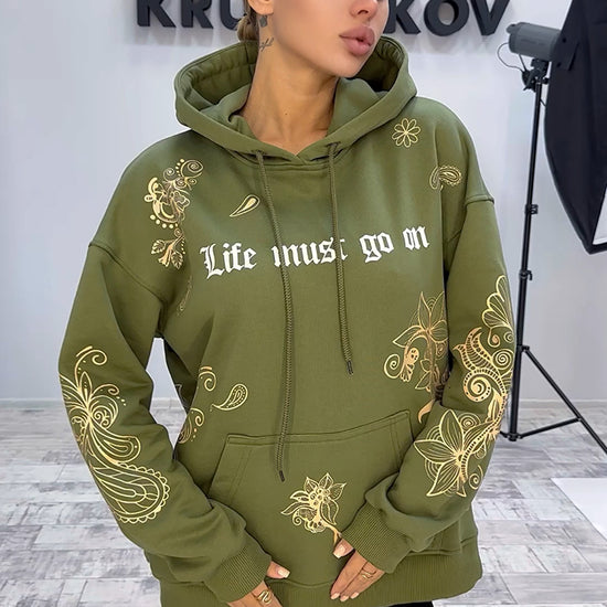 💚 Жіноче худі Life Must Go On від KRUTYAKOV — це про настрій, стиль і комфорт на щодень. М’який колір хакі, контрастний білий принт “Life Must Go On” та витончені декоративні візерунки у теплому золотисто-жовтому відтінку роблять модель виразною, але не “крикливою”. Ідеально для тих, хто любить streetwear із характером.