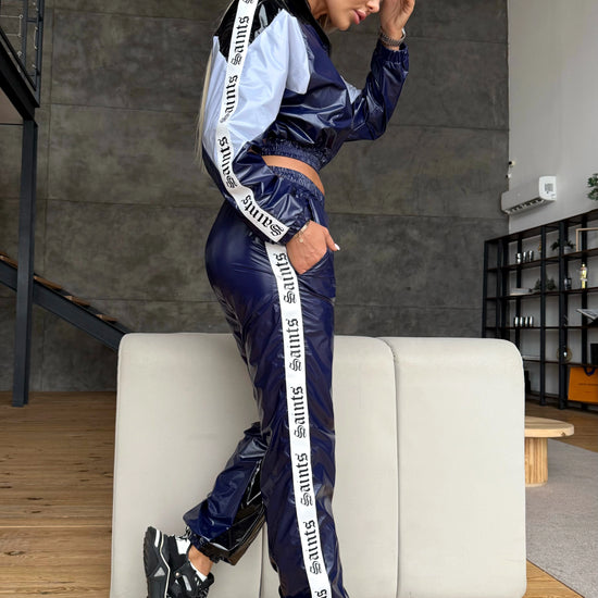 Синій глянцевий колір виглядає глибоко, дорого та ефектно — ідеально підходить для міського стилю, подорожей, фотосесій, вечірніх виходів або стильних повсякденних образів. Це не класичний спортивний одяг — це модний statement-костюм.