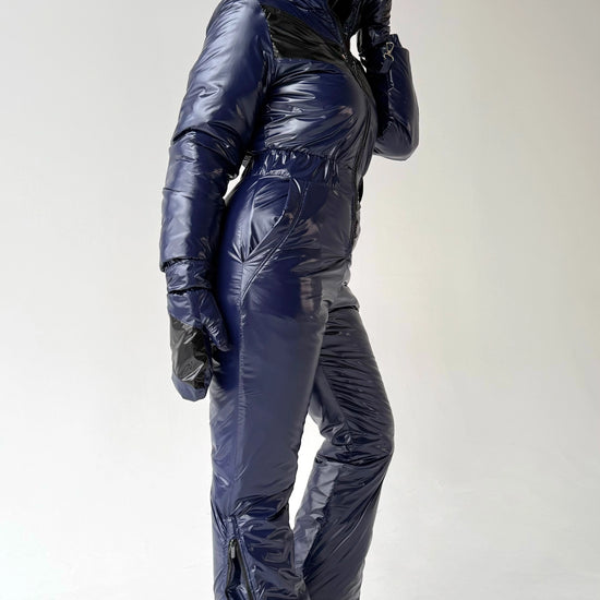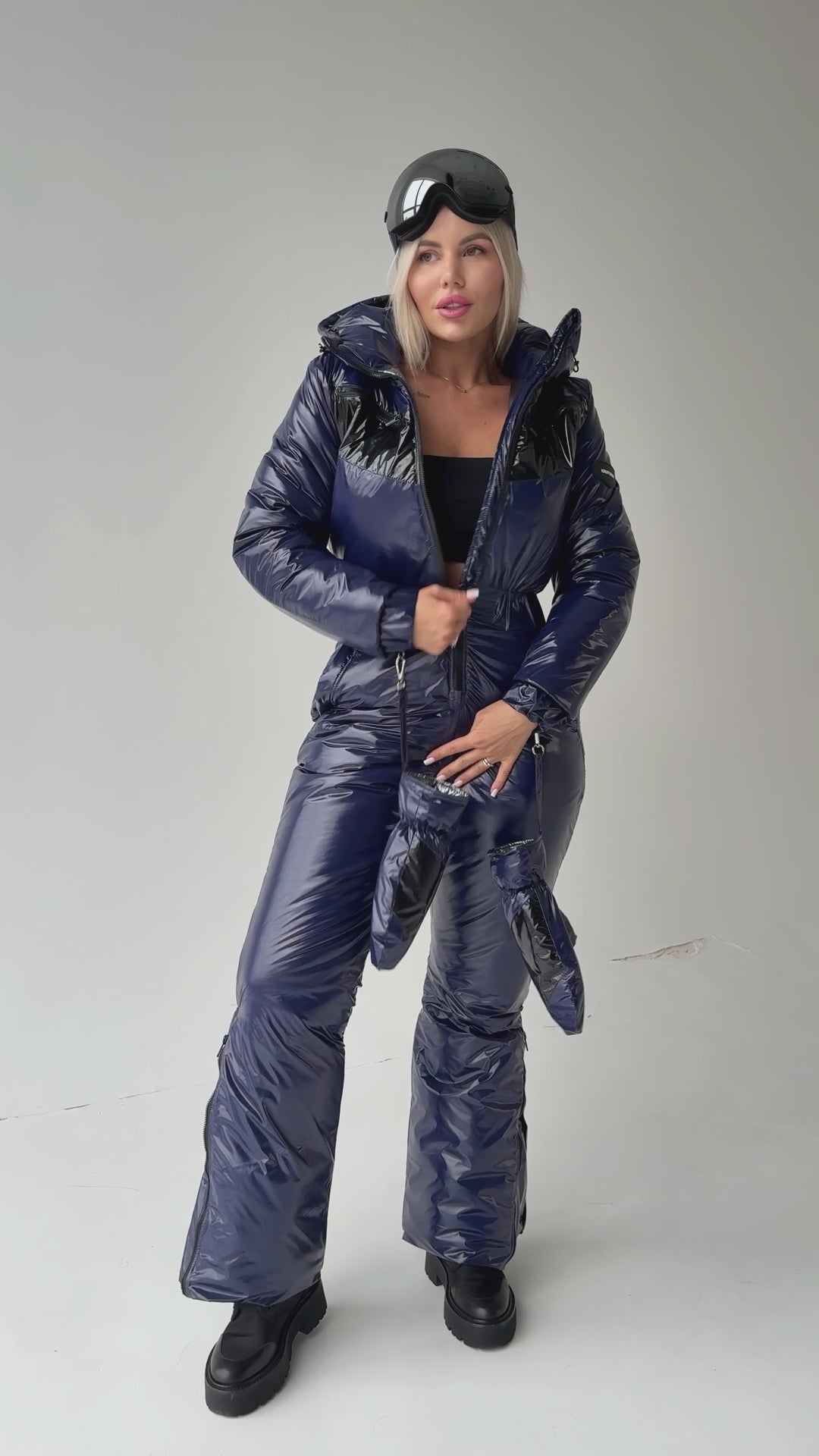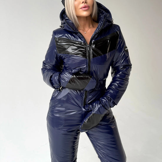 Комбінезон виготовлений з міцного зносостійкого матеріалу з глянцевим ефектом, який добре захищає від вітру, снігу та вологи. Темно-синій колір виглядає дорого та універсально, легко поєднується з зимовими аксесуарами та взуттям.