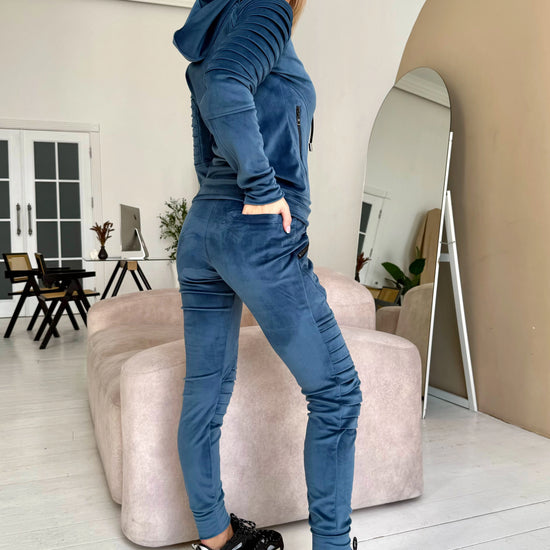 Цей костюм поєднує комфорт і вишуканий стиль. Рельєфні елементи на рукавах і штанах створюють глибину та візуальний об’єм, а блакитний велюр додає образу свіжості та легкості.